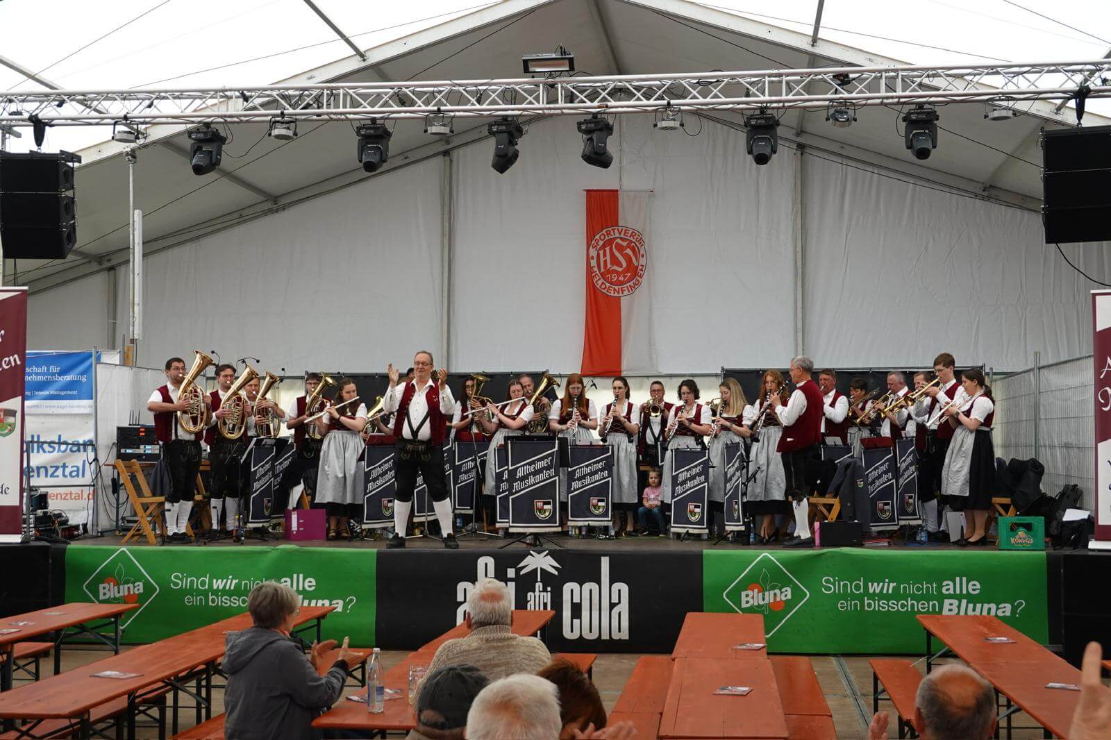 Bei vollbesetztem Zelt sorgten wir anschließend für den musikalischen Teil. Fünf Stunden lang – mit einer wohlverdienten Pause zwischendurch – unterhielten wir das bestens gelaunte Publikum mit feinster Blasmusik. Märsche, Polkas, Walzer, Schlager – von allem war etwas dabei! Die Gäste sangen, schunkelten, klatschten oder ließen es sich bei Bier und gutem Essen schmecken.